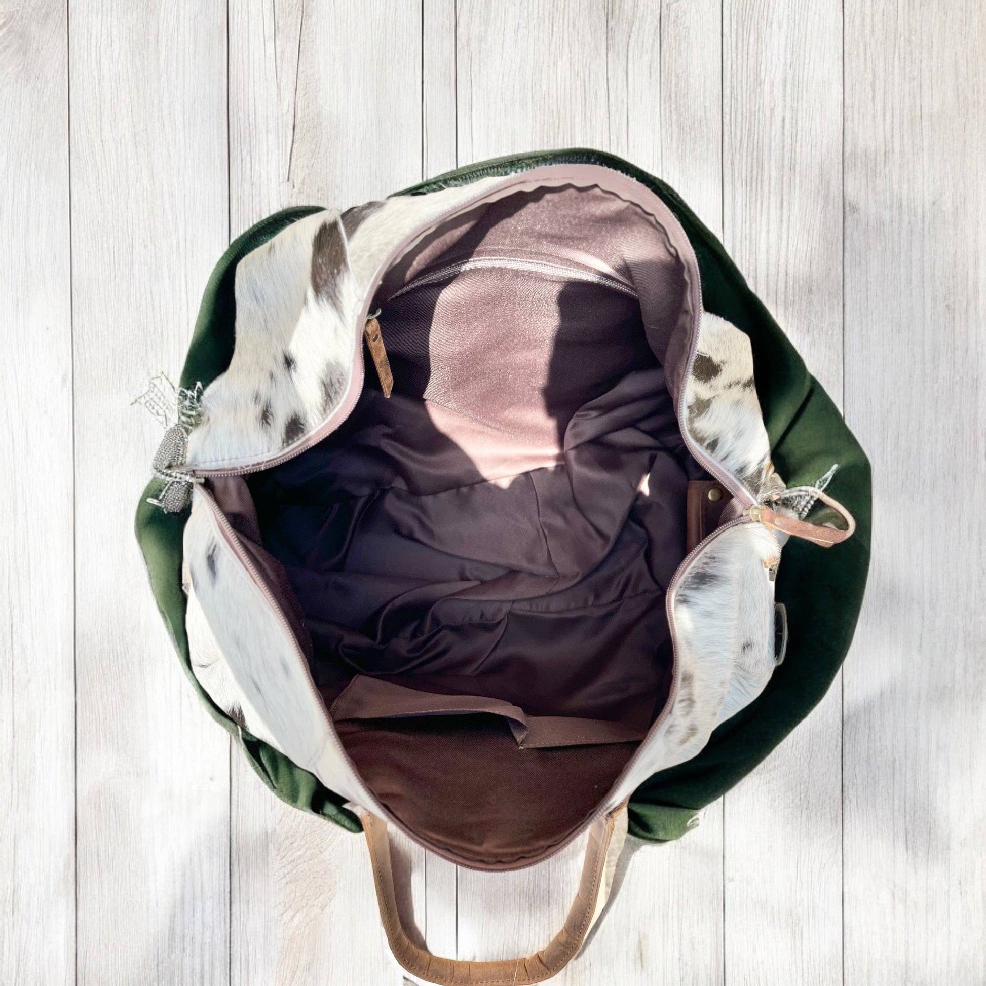 Ready for your next adventure? This brown tooled leather and cowhide duffle bag is as sturdy as it is stylish. Lined with soft velvet for a touch of luxury, it features a long tooled leather strap and handles that make carrying a breeze. Whether you’re heading to the gym or jet-setting across the globe, this bag will keep your essentials safe with a wink of wild charm.