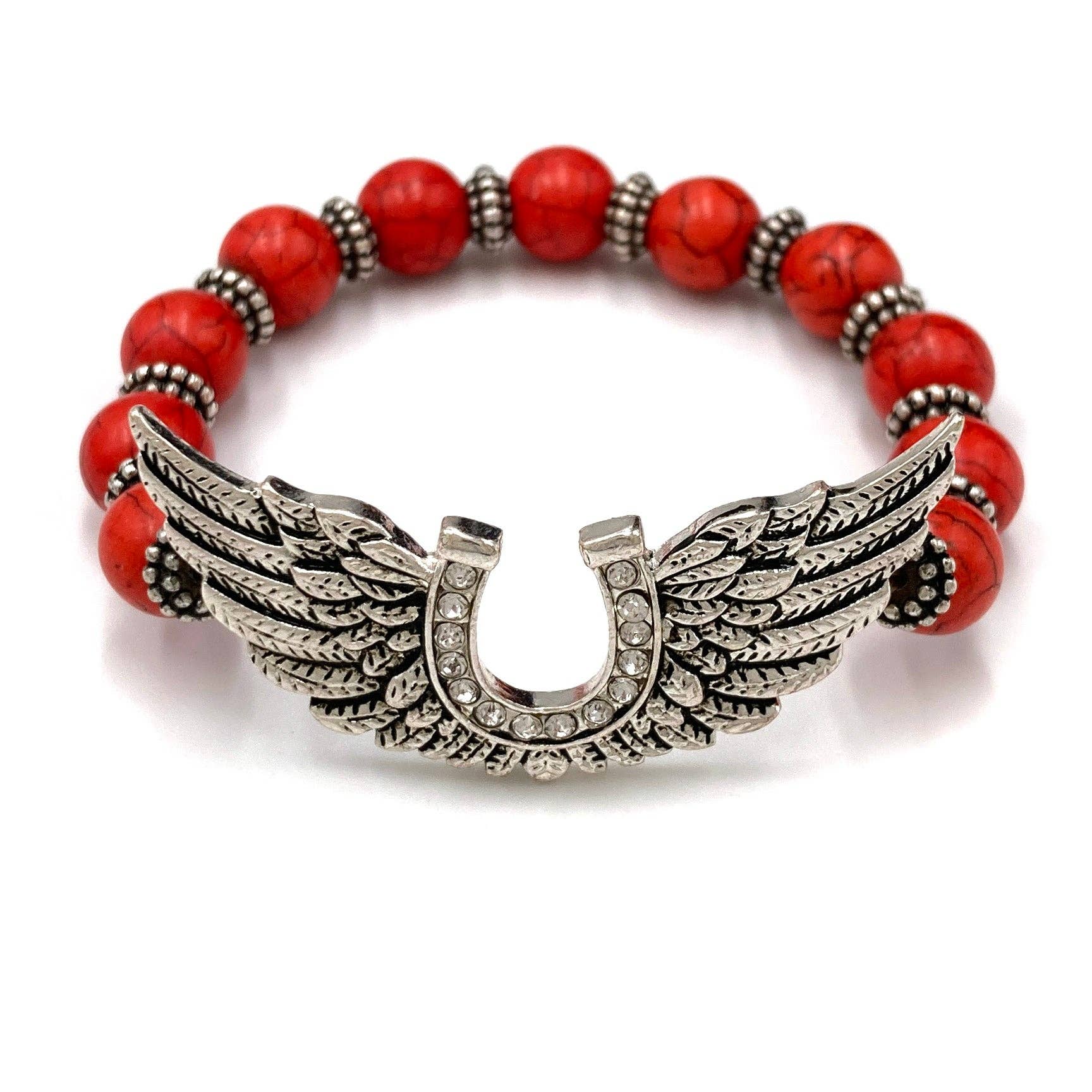 Horseshoe Angel Wing Red Bead Stretch Bracelet