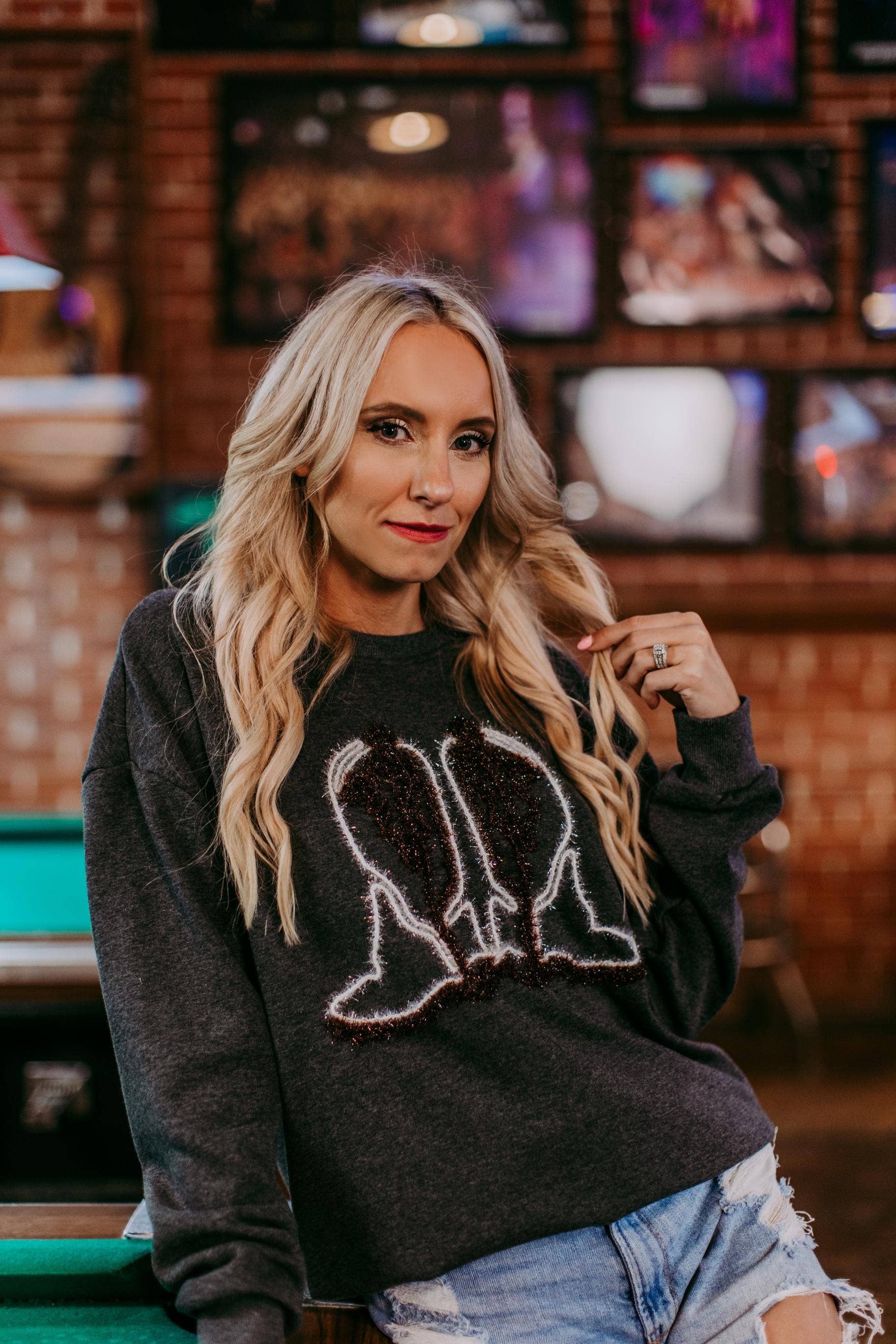 This pullover sweatshirt is the perfect addition to any casual wardrobe this Fall. The tinsel embroidery outlined boots gives a dynamic visual effect. The crewneck style offers a classic and comfortable fit. Pair with jeans or leggings for most daily occasions. Cotton/Poly/Spandex blend