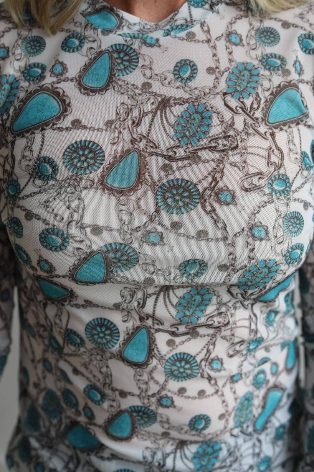 Elevate your Western wardrobe with this stunning sheer mesh long-sleeve top! The features an eye-catching silver chain and turquoise concho print set against a crisp ivory backdrop—perfect for layering or making a bold statement. With its intricate jewelry-inspired design, this piece brings Southwest flair to any outfit. Comes in a convenient 7-piece pack, ideal for boutiques, resellers, or anyone who can't choose just one. Versatile, chic, and undeniably Instagram-worthy!