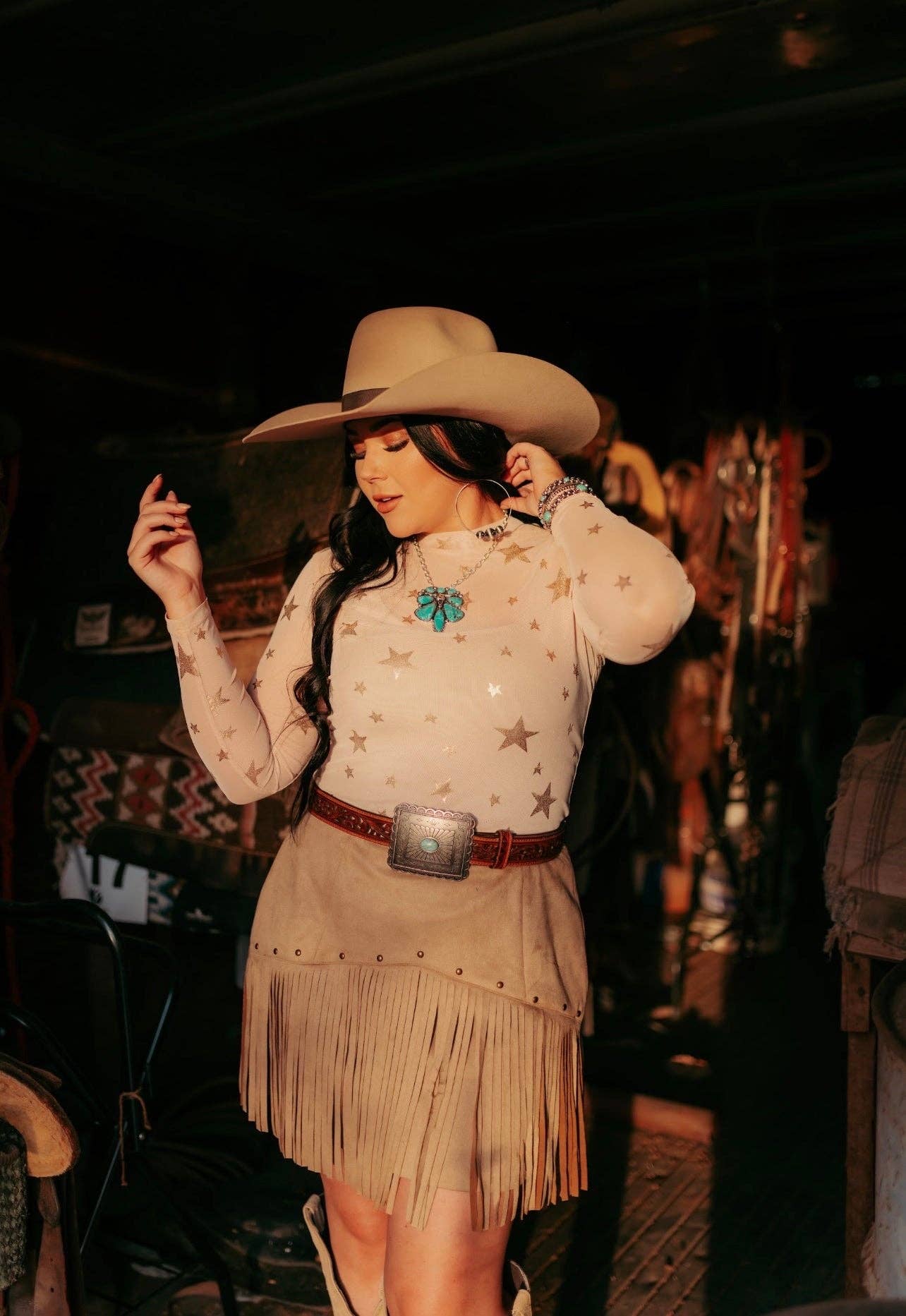 Starry nights meet daytime style with this shimmering rose gold mesh top! Lightweight and breathable, the all-over star print catches the light beautifully while the fitted silhouette keeps things sleek and polished. Long sleeves and a crew neckline make it endlessly versatile—layer it over a cami for an effortless look, or wear it solo for a touch of celestial glam. Perfect for anyone who loves a little sparkle without the drama.