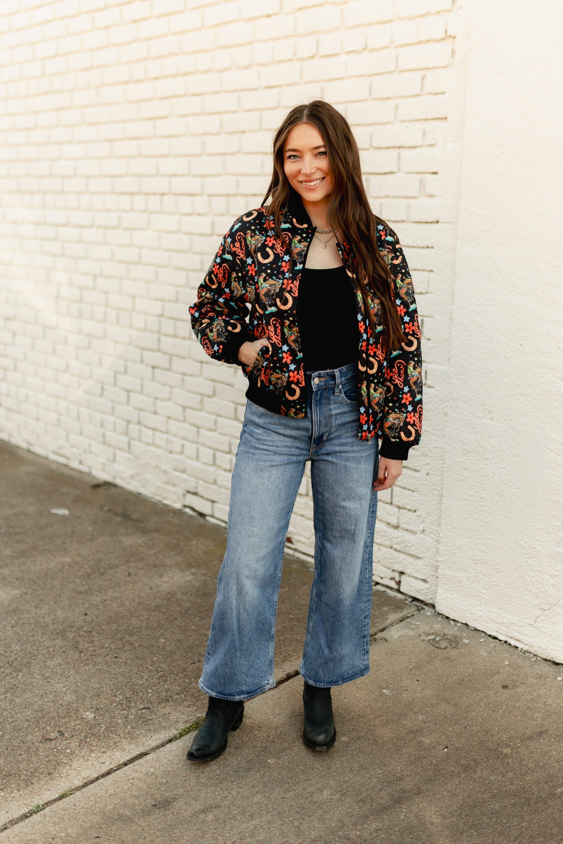 Saddle up in style with this eye-catching Western-themed bomber jacket! Featuring a bold all-over print of cowgirls, horseshoes, florals, and "Howdy" script against a classic black backdrop, it's the perfect statement piece for any wardrobe. Built with authentic bomber details—ribbed knit collar, cuffs, and hem—plus a convenient front zip and side pockets, this jacket delivers both personality and practicality. The lightweight yet structured fabric works beautifully for year-round layering, while the relaxed, slightly cropped fit keeps things modern and fun. Yeehaw!