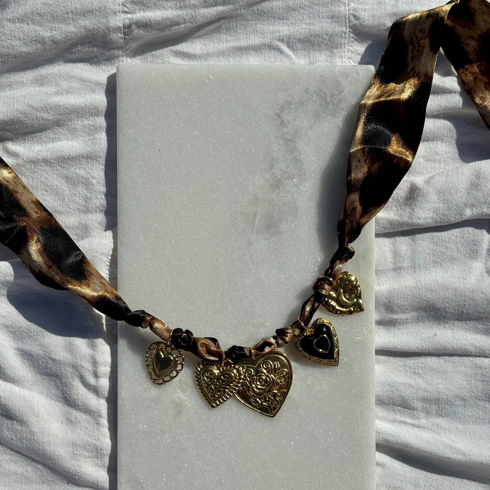 Fiery vintage silk cheetah bandana with 5 gold flat hammered hearts. Necklace is a tie closure so it is adjustable with a 28 inch maximum length.